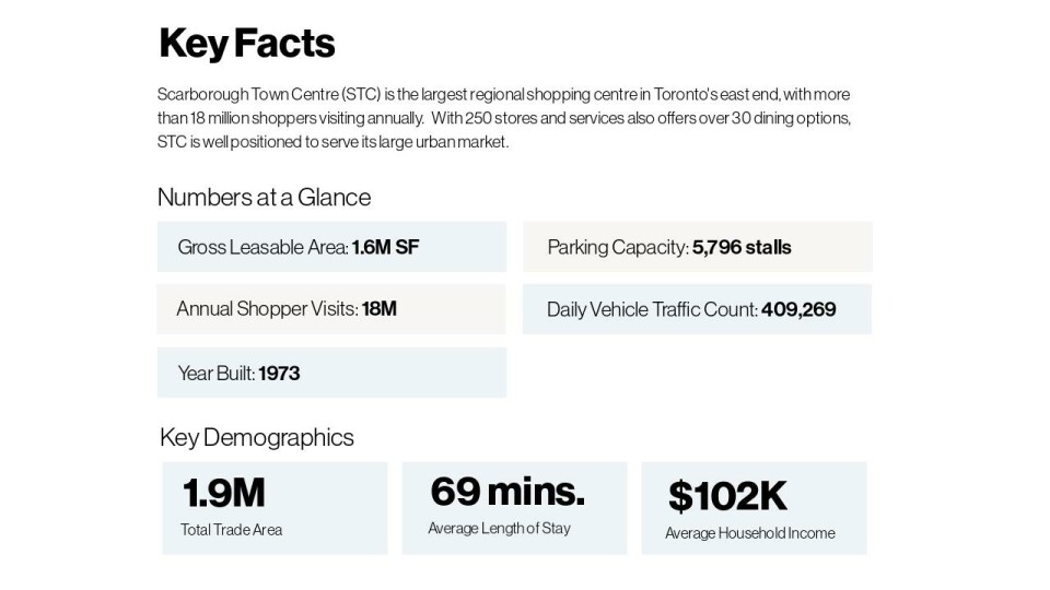 Scarborough Town Centre (STC) is the largest regional shopping centre in Toronto's east end, with more than 18 million shoppers visiting annually. With 250 stores and services also offers over 30 dining options, STC is well positioned to serve its large urban market.