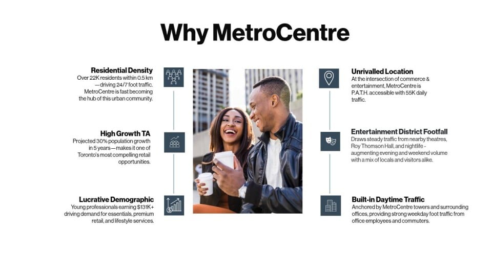 Anchored by MetroCentre towers and surrounding offices, providing strong weekday foot traffic from office employees and commuters.