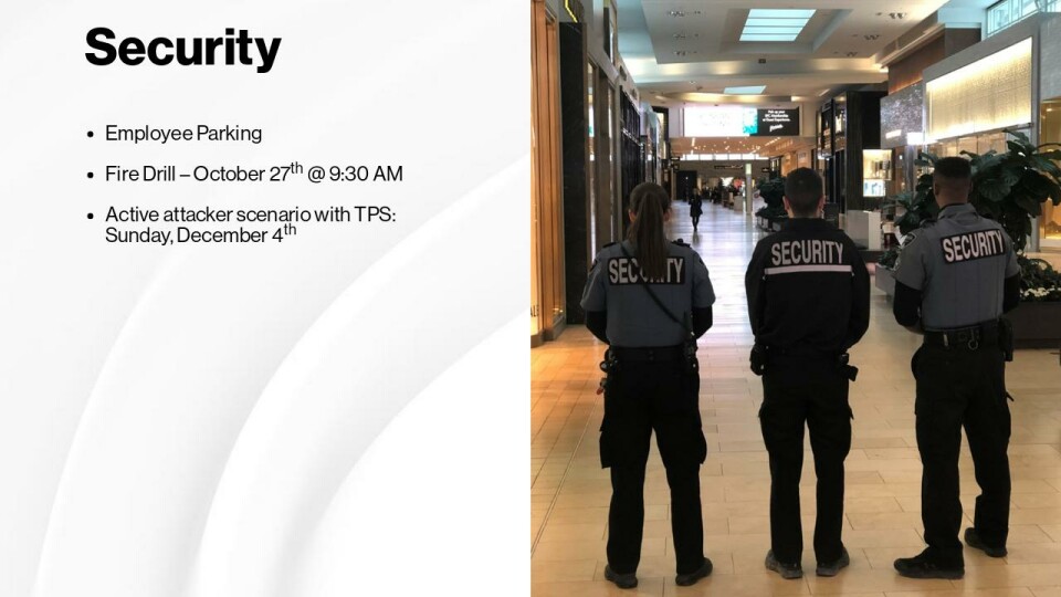 Employee ParkingFire Drill – October 27th @ 9:30 AMActive attacker scenario with TPS:Sunday, December 4th Security